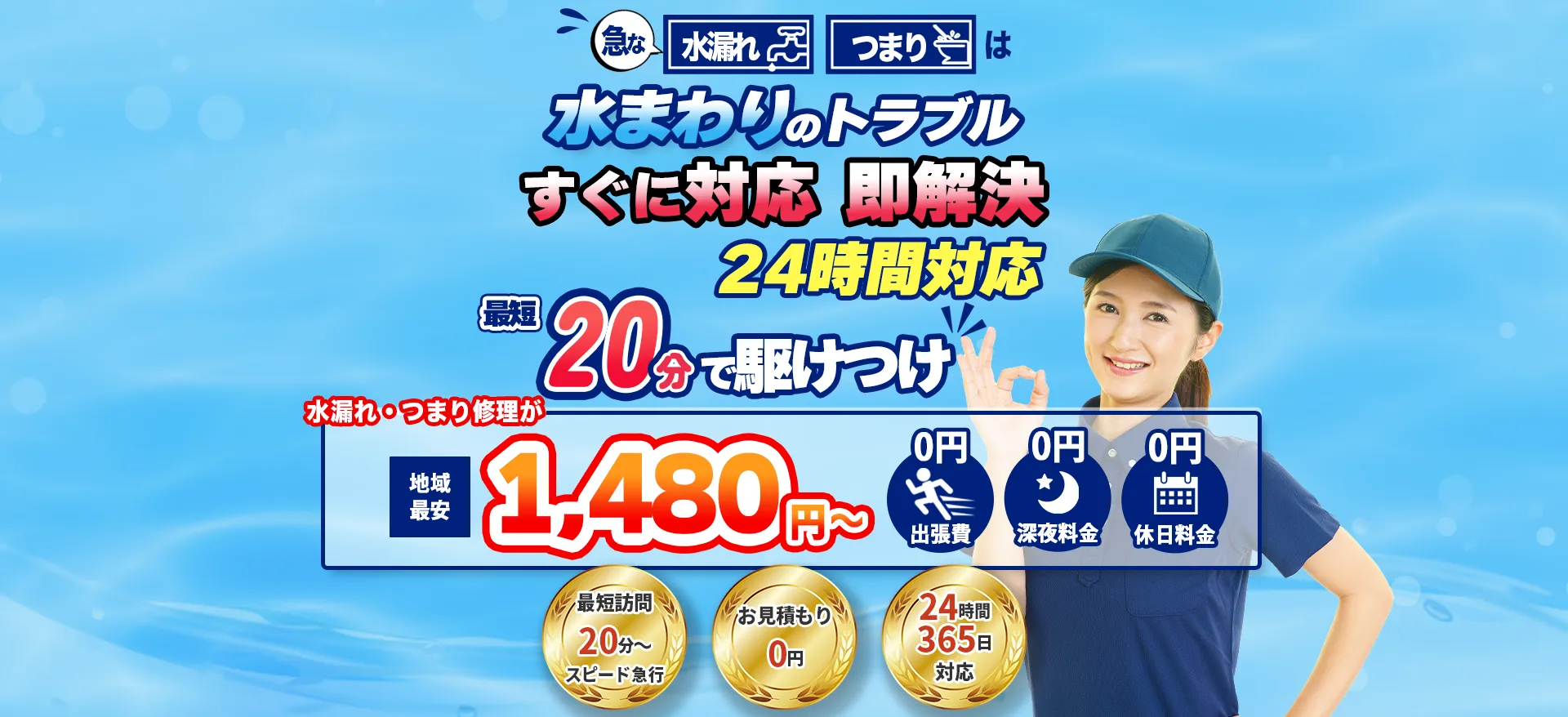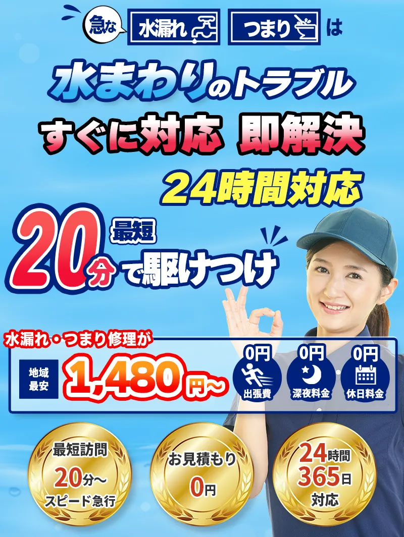 水回りに関する「困った」には、出張費・見積もり費用無料で対応しています。お客様のお住まいの場所によって費用を請求することはありません。見積もり内容にご納得いただけない場合は、お断りいただいて構いません!